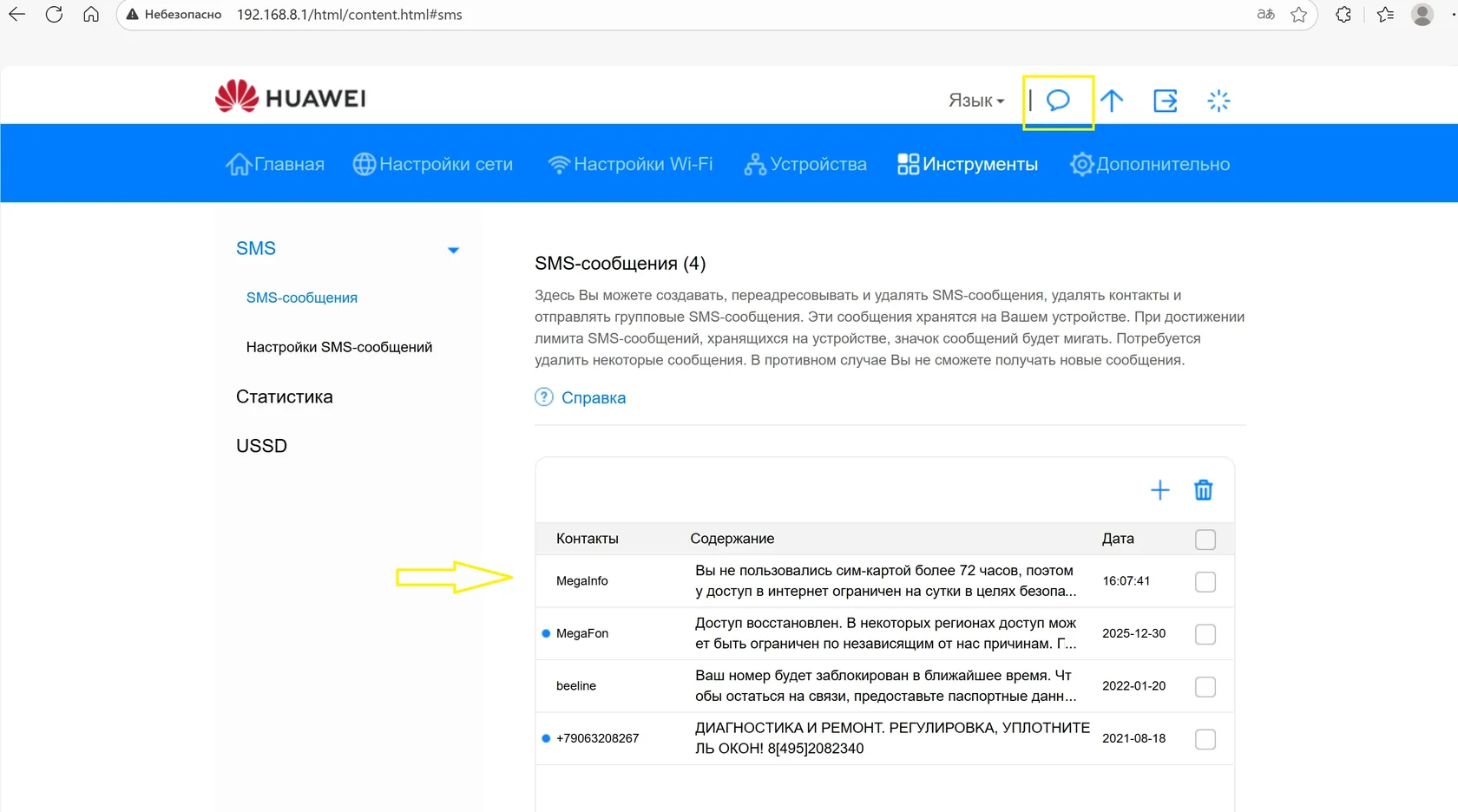 Перейдите в меню «Сообщения», нажав на иконку в правом верхнем углу интерфейса. На экране вы увидите сообщение от оператора МегаФон о том, что доступ к сети заблокирован.